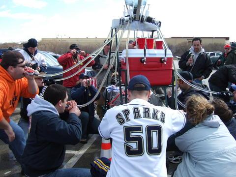 With March Madness well underway, that means baseball season is right around the corner. And no matter if your baseball team is a lovable loser or is in store for a great season, there is nothing like tailgating before a baseball game. That attitude and love of tailgating is no more exemplified than in the form of The 12 Man Beer Bong. You read that correctly. 12 people can simultaneously bong beer while tailgating. This 600 pound monstrosity stands almost 9 feet tall, can handle two kegs of beer and requires its own cart for transportation. Did I mention that it can serve two different kinds of beer at the same time? You know, for those light beer drinkers that are watching their girlish figure when funneling beer.