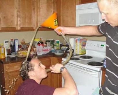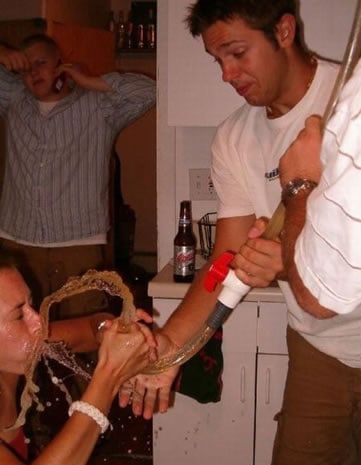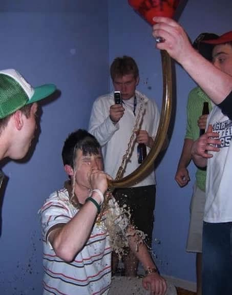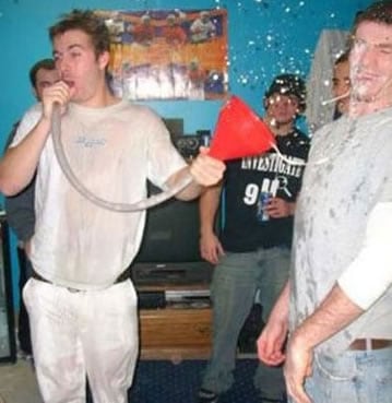 The main reason beer bongs fail is due to how fast your beer shoots out. Some beer bongs can be purchased with on/off valves to help prevent this, but old school beer bongs don’t. Remember to gulp fast and never break the seal between your mouth and the hose. The dude in the background is obviously calling his friend to tell him about the epic beer bong fail he has just witnessed.