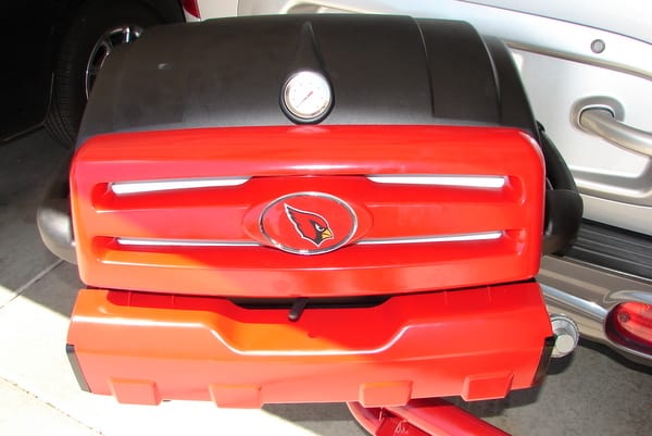 It was about two years ago when friends of TailgatingIdeas.com were flying the colors of the website in the form of a banner and were kind enough to send us photos of themselves playing beer pong on their portable Port-o-Pong inflatable beer pong table. They are big Arizona Cardinals fans and have since upgraded their tailgating gear to include a Ladder Golf game and a Drill Blender. I convinced them they needed to step their game up to a custom tailgating grill complete with Arizona Cardinals colors and logo. They agreed and we customized a Margaritaville Tailgating Grill to their exact specifications for them. Check out the photos they took of it before it made it’s maiden voyage to the University of Phoenix parking lot. (Click on the images for larger view)