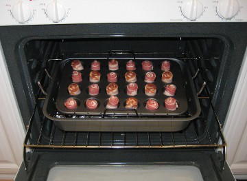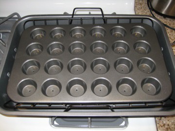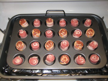 Next step is once you have cleaned out all the metal shavings produced by the drilling, place the muffin tin in a roasting pan or a broiler pan in order to catch the bacon drippings. Pre-heat your oven to 375 degrees.