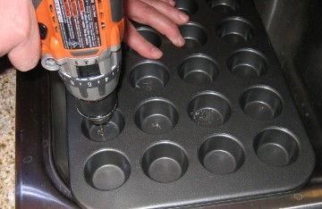 First things first. You will need to drill drain holes in the mini muffin tin in order to allow the bacon grease to drain out. We used a 1/8″ drill bit but any size you are comfortable with will do. Just don’t make it too small or the grease will not drain properly.
