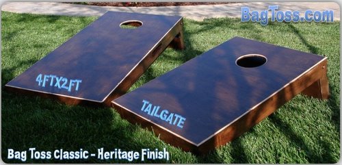 Cornhole boards made by Bag Toss come in two types of finishes, Heritage and Natural. The Natural finish is several clear coats over the bare wood. A Heritage finish involves staining the wood and then applying clear coats. The Heritage finish costs a bit more due to the extra step of staining. The stain work is not furniture quality, but it still looks really good. Each finish can be painted on for those that want to customize their own cornhole board.