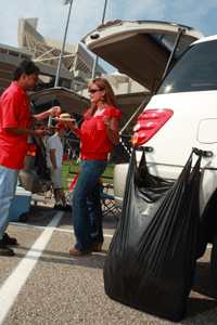 Because tailgating is a “temporary party” in the parking lot, tailgate parties tend to produce a lot of trash and recyclables. Many tailgaters opt for disposable products like plastic cups and paper plates because of the convenience factor of not having to bring them home. But with increased convenience comes an increase in trash and with increased trash comes the issue of disposing of it all.