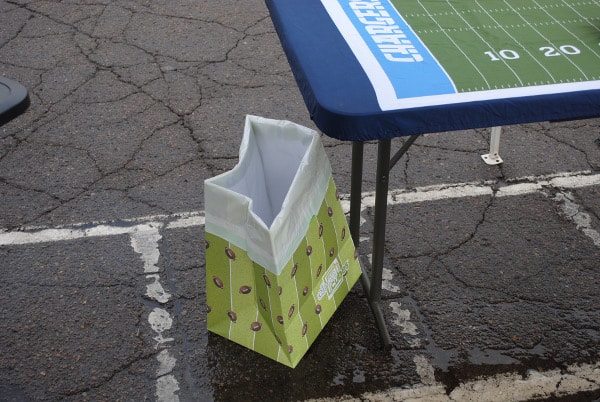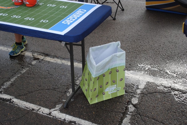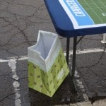 The concept of Clean cubes is not really groundbreaking or revolutionary but makes trash and recyclables collection easy and convenient. Set up and breakdown time while tailgating is precious so the less time you have to devote to setting something up and taking it down, the better. The samples we received are designed for tailgating complete with footballs on the bag. There are other designs of Clean Cubes that can fit a home party, picnic or other times you may just need another receptacle for your trash and/or recyclables.