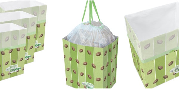 As you saw in the video, Clean Cubes are a complete trash solution, composed of a plastic trash liner adhered to a paper bin. Its instant setup and easy cleanup solves the problem of trash or recyclable build-up at parties, events, and many other situations. Clean Cubes are made from 50% recycled paper and is patented.