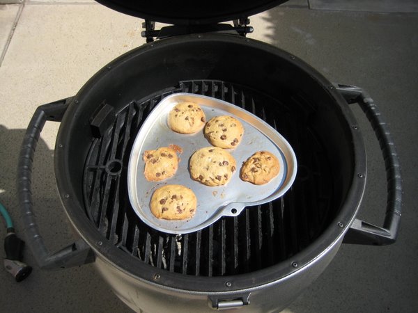 I took them off the sheet and let them cool. Once cooled, I tried one and they tasted just as they would normally had they been cooked in a traditional oven. There was no smokey flavor. The bottoms of the cookies were not burned because the charcoal was under the pan. Based on the taste, no one would have known they were “baked” on a BBQ grill.