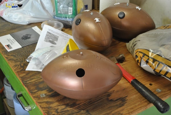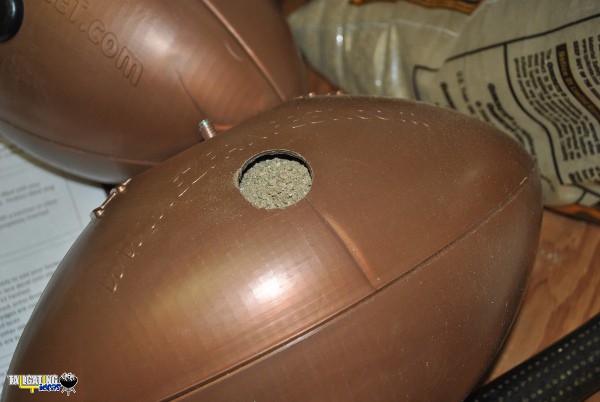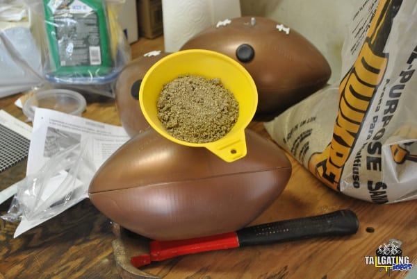 Upon receiving the samples from EZ Fan Feet, I took them to the garage and located the leftover bag of playground sand I had used to fill up the base of my son’s basketball hoop. I broke out the funnel and started scooping sand into the EZ Fan Feet. I filled each one full with what I perceived to be about 10 pounds of sand each and tapped in the cap with a hammer. I then applied the white decals that are made to look like the laces of a football in order to complete the look.