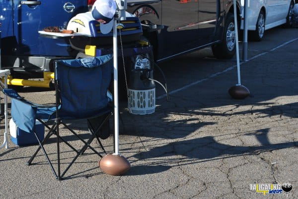The next test was to take the EZ Fan Feet tailgating at the Chargers vs. Broncos Monday Night Football game. Once parked I installed the EZ Fan Feet on the bottoms of the 10 x 10 tent legs in a matter of a couple of minutes. There was no need for any washers this time around because the smaller tent had smaller holes which it appears the EZ Fan Feet were designed to accommodate. Outside of Qualcomm Stadium can get a bit windy as well and sure enough, we got our fair share of wind gusts that Monday. Again, the EZ Fan Feet held the tent anchored to the ground and they prevented the tent from moving at all during the strongest of wind gusts.
