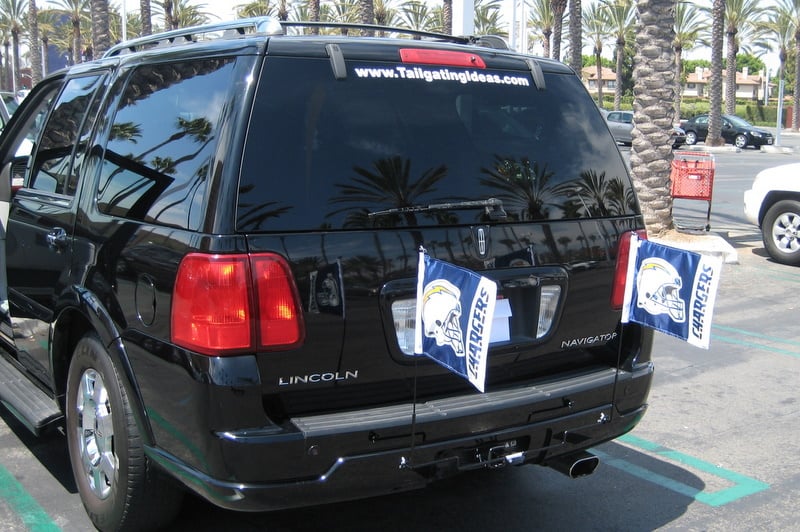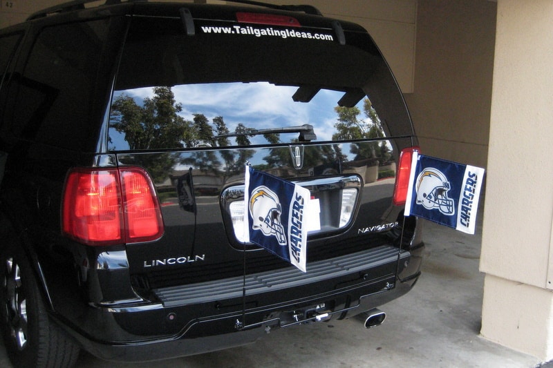 As you can see from the photo at left and those accompanying down below, Fan E Flag is a dual flag flying system that inserts into your 2″ or 1-1/4″ tow hitch and flies two flags behind your car. I was sent a sample Fan E Flag system and tested it out myself. I tried it a few times on the back of my Lincoln Navigator and took it up to full highways speeds in excess of 70 mph. (Honestly your honor, I needed to go that fast so I could fully test a new tailgating product in order to maintain my journalistic credibility.) The system held in place perfectly without any rattle and the flags withstood all that wind. Quite honestly, now that I have a Fan E Flag system, my old car window flags look like they may be headed to the donation center. Take a look at some other photos of the Fan E Flag system on display. (Click images for larger view)
