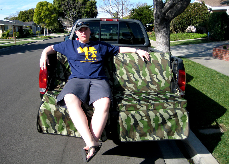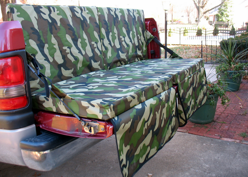 Before you discount the Tailgate Couch as a glorified futon cushion removed from the wooden frame, this item is specifically designed to fit on the tailgate of a pick-up truck. (The Tailgate Couch doesn’t fit “step side” or “flair side” models. If your tailgate is 5 feet wide, the Tailgate Couch will fit.) The cargo strap that is used while the unit is set up on tailgate is also used to secure the unit in the folded position for storage and transportation. The strap doubles as a handle to carry it to and from your tailgate. The Tailgate Couch will fold completely flat and can be used as a bed and fits between the wheel wells of a pickup truck bed. That’s good news for your overindulgent tailgating friends who may need a little nap time before kick-off if they hit the margaritas too hard.