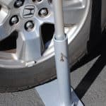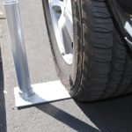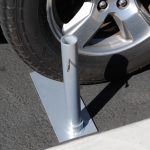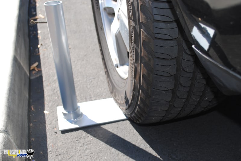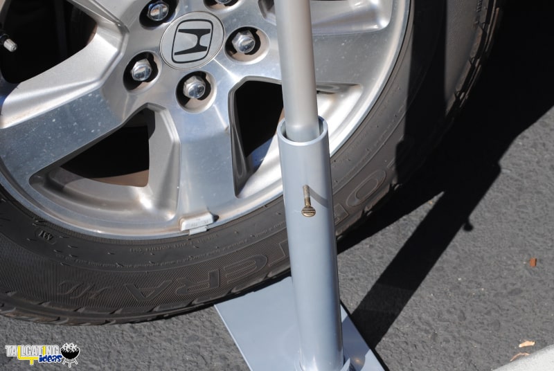 Step 2: Place the base behind your tire and carefully roll your vehicle directly onto it in order to hold it steady. Insert the flagpole into the base and tighten the holding pin.