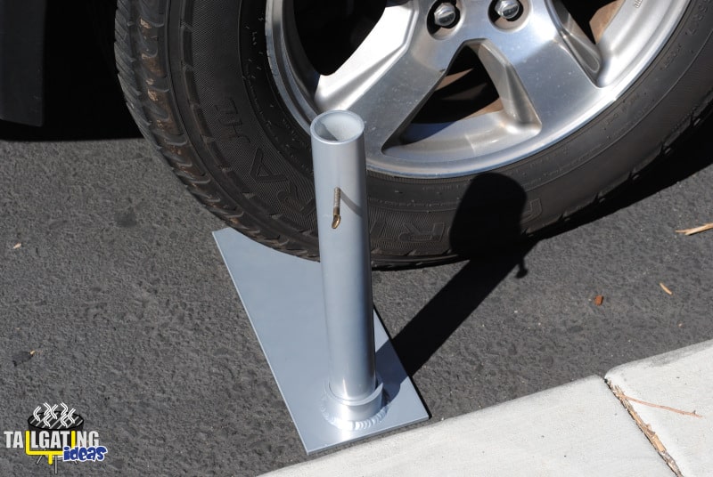 Once you arrive at your tailgating space, find an area directly above one of your tailgating vehicle’s tires that is unobstructed by trees 15 to 20 feet above your vehicle. The FLAGPOLE-TO-GO raises in sections and if you choose or do not have the height available, you can raise it a few sections accounting for your preferred height.