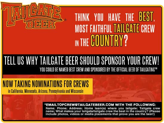 Since tailgate Beer is distributed in a few states including California, Minnesota, Arizona, Pennsylvania and Washington, those tailgaters residing in those states are eligible. Feel free to nominate yourself or someone you know and email the particulars to: topcrew@tailgatebeer.com. Good luck.