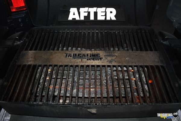 As you can see in the “Before” photo, the Tailgating Ideas logo in the middle of our grill grate was fully encrusted with grease and grime from previous tailgate parties. The caked on residue was left over from tailgating probably about five weeks prior to the bowl game. As you can see in the “After” photo, the grill grate came out very clean. Here are the instructions on how to use the Grill Daddy Pro.