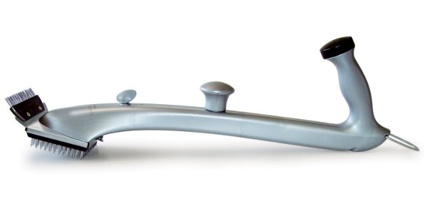 4. To finish cleaning the grill, grip the Upright Handle in one hand and the Leverage Knob in the other hand. This will give you maximum leverage to brush away the residue without getting your hands too close to the heat. Use the Main Brush and brush the grill in the direction of the grill grates, releasing the water as you brush. Brush until the grill is sparkling clean and free of dirt.