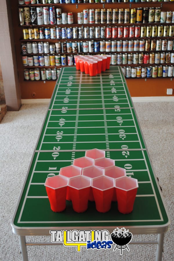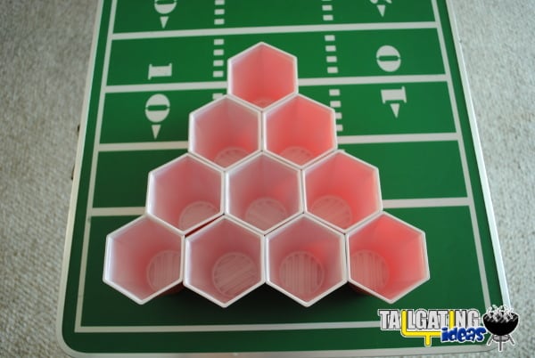 As you can seen in the above photos, Hexa Beer Pong Cups have taken the traditional round cup opening and made a hexagon out of it. This way the flat edges can line up against each other and form a honeycomb. By reducing the gaps between traditional round cups, the playing surface is larger and increases the chances of making shots. Successful shots make for a faster game allowing more people to play in the same amount of time. Also, a faster game is preferable while tailgating based on the limited amount of time you have in the tailgating parking lot.