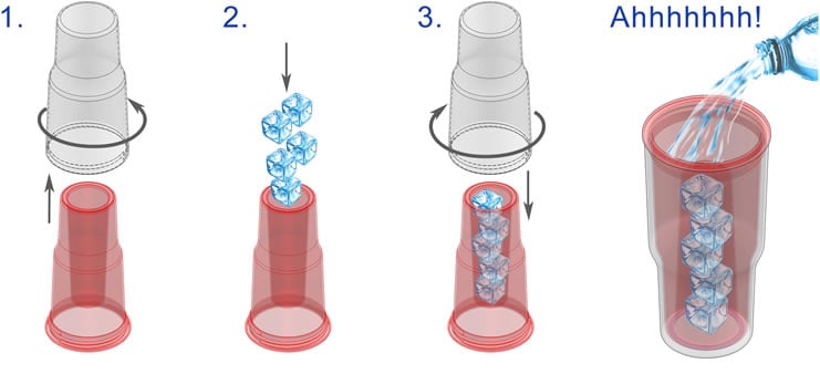 As you saw in the video, the IceSoKool cup is a dual chambered cup with a cylinder in the middle. You place ice cubes in the center cylinder and as the ice melts, keeps your beverage cold