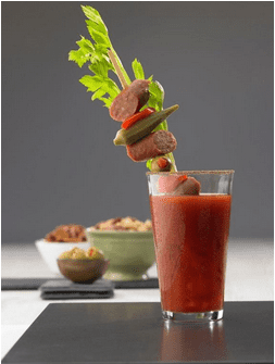 - For the garnish, assemble each of the four skewers with the sausage, sliced red pepper, gimlet olives and pickled okra, place into cocktail with celery stalk.