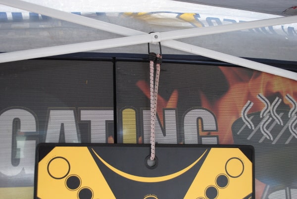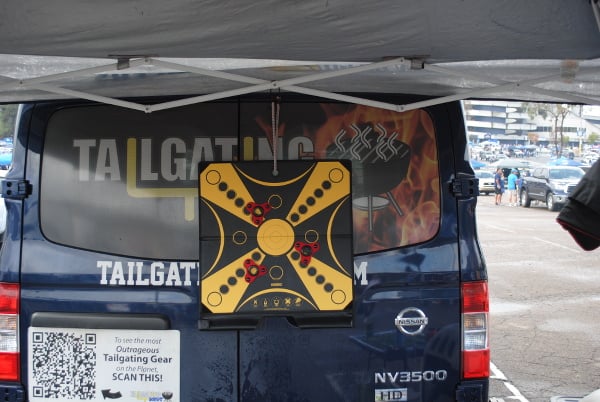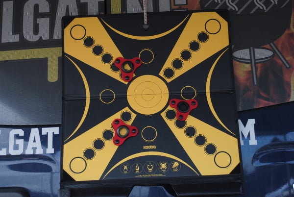 We had a chance to test out Kooba and took it with us to the San Diego Chargers vs Cleveland Browns game. Our first concern was, how would we set it up while tailgating? There are no solid walls to hang things while out tailgating and the majority of examples we saw of Kooba being played were indoors hanging from a wall. As you can see in the photo below, we figured out a way to hang it using a bungee cord and the frame of our pop-up tent.