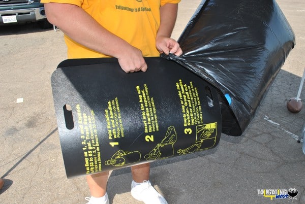 As you can see in the gallery, we took the Kwickan and the smaller Kwickan II with us while tailgating the San Diego Chargers vs Houston Texans Monday Night Football game. Setting up the Kwickan and inserting it into the trash bag took literally less than 10 seconds. Once set up we had a larger trash can that was available for refuse like paper plates, plastic cups and utensils. We used the smaller Kwickan II to bag recyclables and placed crushed aluminum cans in it. Once the time came to pack up and head inside the game, we simply removed the Kwickan from the bags and grabbed the ties and tied up the bags. The trash bag was ready to go to the dumpster on our walk into the game and the recyclables were placed inside our tailgating vehicle to be taken home and recycled during the week.