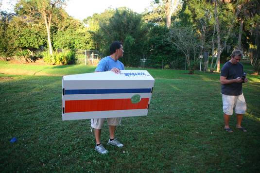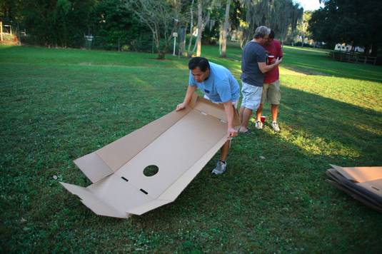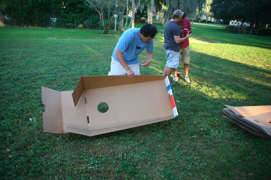 As you can see in the photos, MyKornhole boards are made of heavy duty corrugated cardboard with slots and flaps to fold into a cornhole game board. The boards, when fully assembled, measure 4′ x 2′ just like a regulation competition cornhole board. The design on the top comes in three choices, Blue & Orange, Black & Gold and Blue & Red.