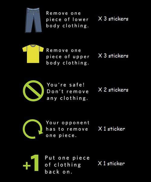 Naked Pong is a sticker pack that has symbols and instructions you place on the bottom of your beer pong cups. Once a ball is sunk into a cup, the opposing player drinks the contents and then turns over the cup to reveal the consequence. Consequences range from remove a piece of clothing, the shooter needs to remove a piece of clothing, the player adds a piece of clothing or the player is safe and does not have to do anything. The stickers for removing a piece of clothing identify if it should be an upper body or lower body piece of clothing.