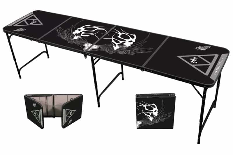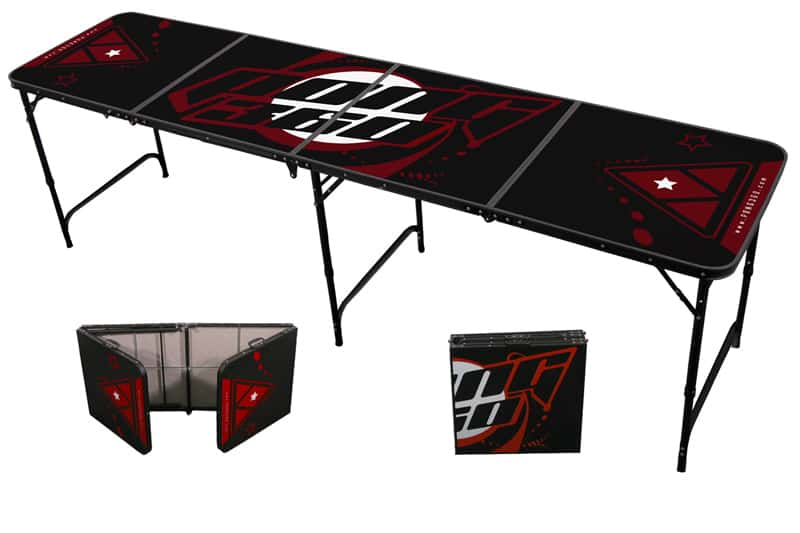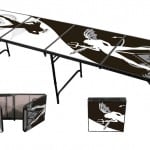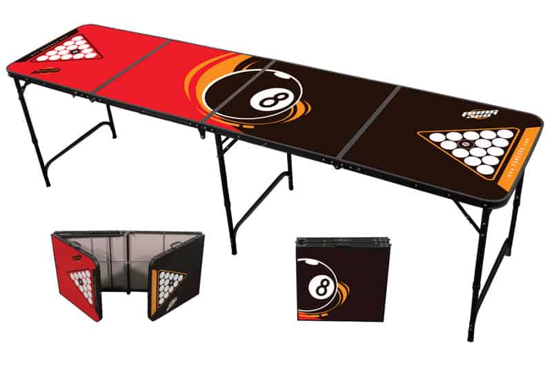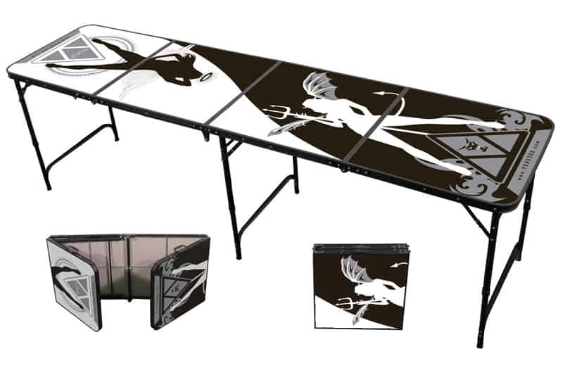 Pong 360 Beer Pong Tables was originally founded by a group of like-minded players with a passion for the sport of beer pong. After surveying what other beer pong table manufacturers had to offer in the way of table designs, they decided to create their own. As you can see from the images above, these are all 8′ x 2′ regular competition tables with a number of designs and themes to choose from. You can select from Super 8-Ball, Nightmare, Greens, Vixens, Beer Pong League or Galaxy themed tables. Aside from the unique designs, Pong 360 beer pong tables include a beer pong ball holder that holds six regulation sized balls underneath the table. Now you don’t have to worry about bringing your beer pong balls separately and accidentally forgetting them. Also, the sturdy hard plastic handles (unlike other beer pong tables which have canvas or cloth handles) make it easy to hold and carry when it is folded for transport.