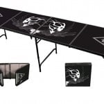 Other features of Pong 360 beer pong tables includes an integrated rack design on the back of the table which allows you to play six or 10 cup games with a perfect rack setup every time. Even though the table weighs approximately 23 pounds, the aluminum used to construct it allows for a sturdy surface and is great for bouncers, if that is part of your game. The top surface of the Pong 360 beer pong table includes a melamine coating for easy clean up from all kinds of alcoholic or non-alcoholic liquids. And because you want to take it tailgating, it folds up into a compact 2′ x 2′ briefcase for ultimate portability. Also, you can use it as a table for flip cup or to set up your tailgate buffet food. Specs include: