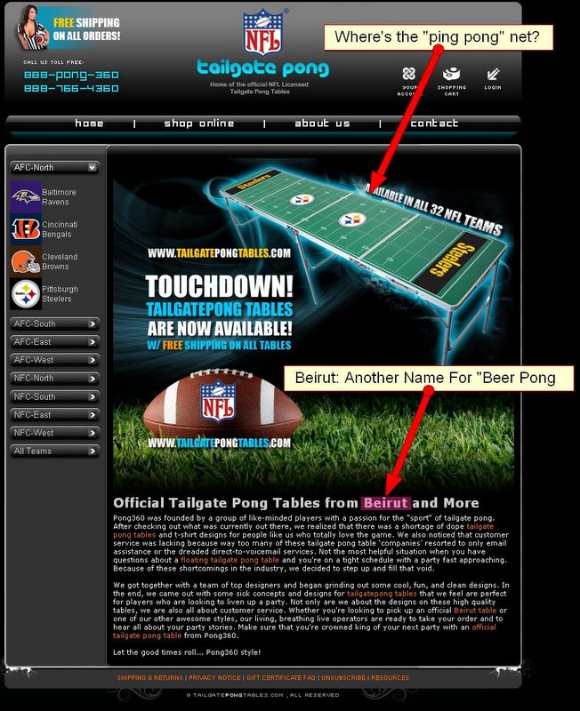 The headline announcing what these tables are all about says, “Official Tailgate Pong Tables from Beirut and More”. So apparently the NFL put the kibosh on using the term “beer pong” but using “Beirut” is okay? There is a huge debate raging amongst those that consider the official name of the game be called “Beer Pong” while others believe the only true name of the game is to call it “Beirut”. No matter where you fall on the beer pong vs. Beirut name debate, the fact is a well established beer pong table manufacturer is marketing the NFL “Tailgating Tables” in association with binge drinking. Again, tremendously hypocritical of the NFL to be profiting from the sale of these items while adamantly proclaiming responsible drinking should prevail in the parking lots. Don’t believe me? Visit the site for yourself. Or if they have already edited the home page, take a look at the screen shot I captured on Sept. 30, 2009.