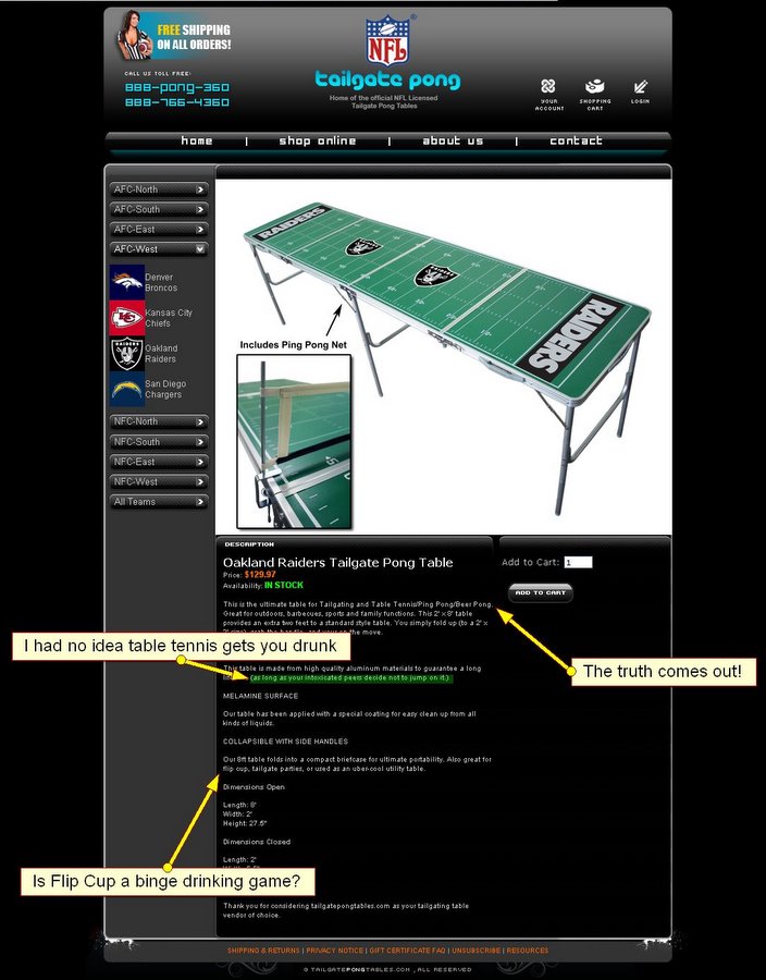 In a nut shell, the NFL is selling officially licensed beer pong tables yet calling them “tailgating tables”. On their official merchandising website they even go as far as to include a wimpy table tennis net in an attempt to insult your intelligence into thinking this table is not used for binge drinking. So why am I beating this dead horse again? Because now there is a new website that has been authorized to sell these NFL beer pong tables. That’s not that big of a deal unless the website wasn’t even trying to uphold the phony facade that these tables will be used for anything other than beer pong. That site is tailgatepongtables.com. (Depending on how soon you read this, the link to the website could fail depending on if the NFL comes in and shuts the website down or not. I captured a few screen shots just in case that did indeed happen.)