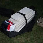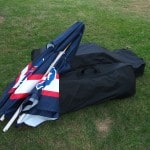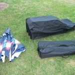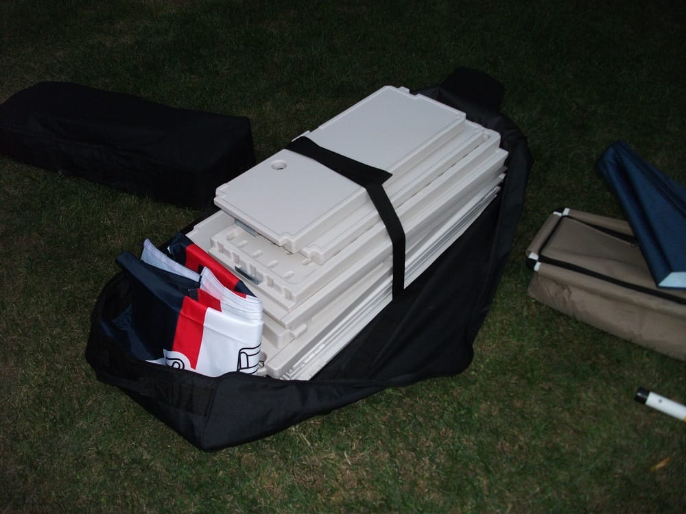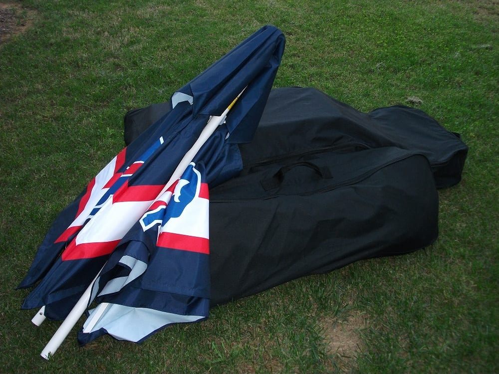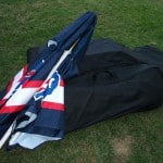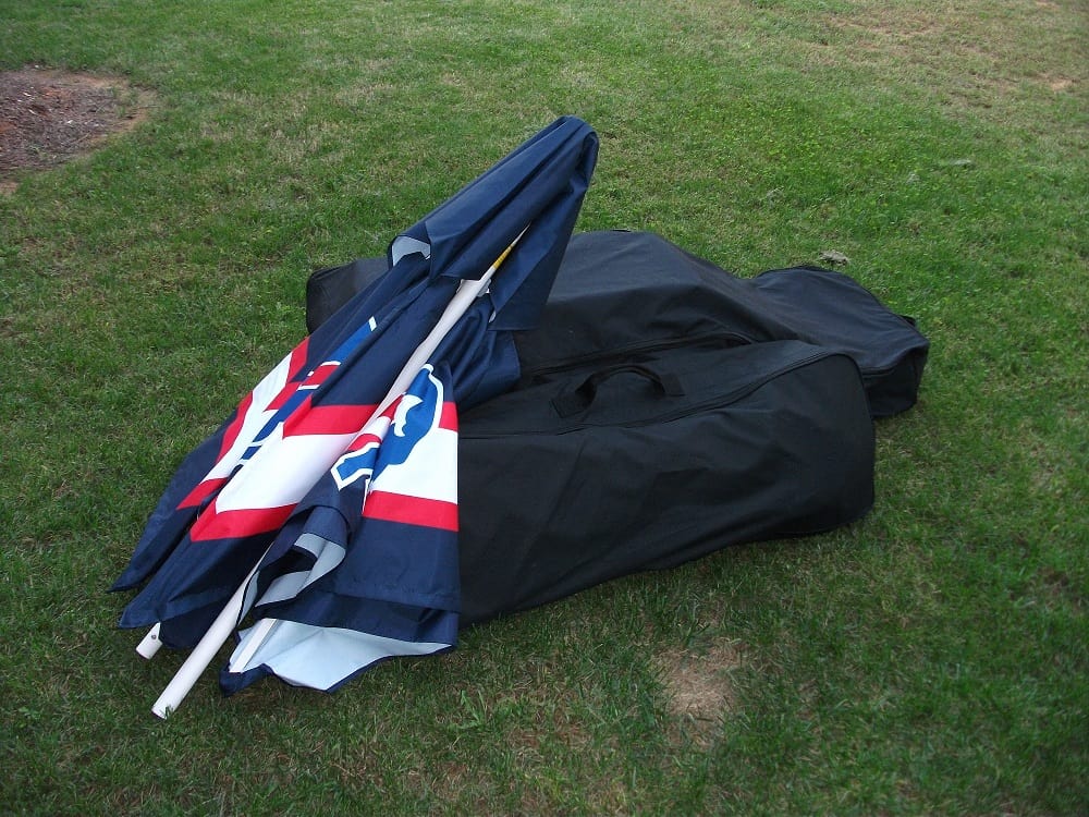 As I mentioned before, the first test looked at was portability. By looking at the pictures you can probably infer that the Best of Times Bar is not some tiny little thing that you just throw in the car, and you’d be right in that assessment. For starters it does have some legitimate heft to it. Now I don’t have the most precise scale but I found the Best of Times Bar to weigh about 63lbs. This may not seem like too much to start with, but when you are getting ready to tear your party down after a long day, any weight is going to be exaggerated. The upside is that the whole thing collapses down and fits into a nicely constructed wheeled storage bag that is included with the bar. The frame has hinges so you just fold it up, and because of the hinges (unlike a map) you can’t really mess it up. The shelves take up the most volume, but if you stack them on the frame in the bag, and put the velcro strap over them, it should zip up easily. You can see what I’m talking about in the pictures above. Once in the bag you can roll it around to where you want it, and in case you had any doubts, they rolled on grassy ground just fine. The stools have a bag of their own (the smaller of the 2 in the pictures), but that is much lighter and easily managed. I would have liked to see a bag for the umbrella, but storing it in the box doesn’t seem like too much of a trade off. Altogether it seems like the typical tailgater would be able to handle the Best of Times Bar with little difficulty.