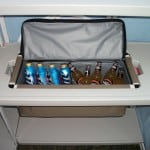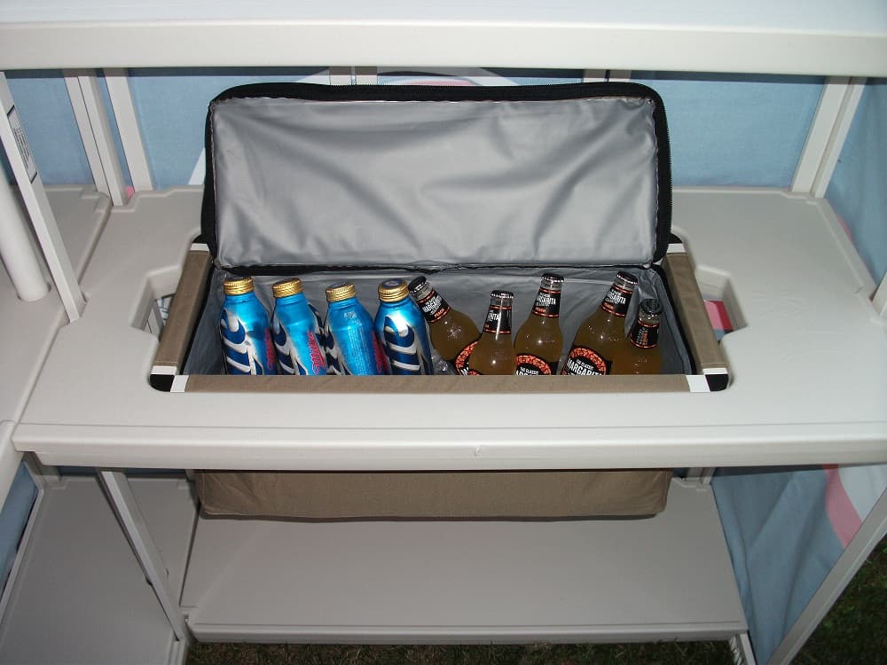 When I think of a bar I don’t think of a table with some liquor on it. Thankfully the Best of Times Bar is a whole lot more than a folding table with a fancy cover. The overall counter height is comfortable enough for either standing or sitting . With ample shelf space, and the drop in cooler you could do a lot with this set up. Speaking of that drop in cooler, it has a cover that closed with a zipper so you can fill it up at home and transport it full. I can see myself filling that thing up with plenty of ice and brew to make for a wonderful tailgate. The middle shelves have enough clearance for the typical grocery store mixer bottles, and your typical 750ml bottles. What doesn’t fit there will certainly go on the bottom shelves with room to spare. Short of a sink I don’t really know where you would make improvements.