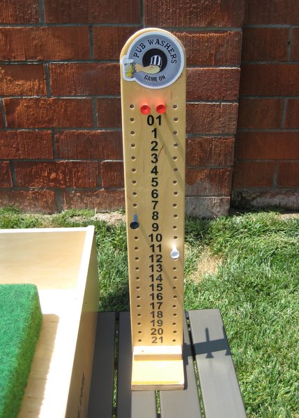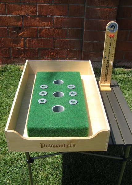 Pub Washers is a portable table top game made for indoor or outdoor play. Ideally suited for a tailgate party, Pub Washers is small enough to travel easily and is attractive enough for the home game room when your team is playing on the road. Unlike traditional washer toss games, Pub Washers is meant to be played on an elevated surface like a folding table or even the bed/tailgate of your truck. The ideal height is 29 inches above the ground which is the the standard height of most tables. Since Pub Washers has a smaller playing surface compared to traditional washer toss games you place on the ground, this tailgating game requires a little more aim and finesse. Another major difference is that you stand six (6) feet away from the front edge of the game box to make your throws. As you can see from the photos below, the carpeted scoring surface is encompassed by an attractive box with a trough to catch errant tosses. With Pub Washers, there is no more bending down and picking up washers off of a filthy tailgating parking lot. (Click images to view Pub Washer game board in larger detail.)