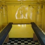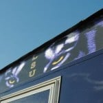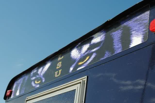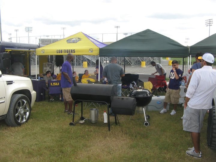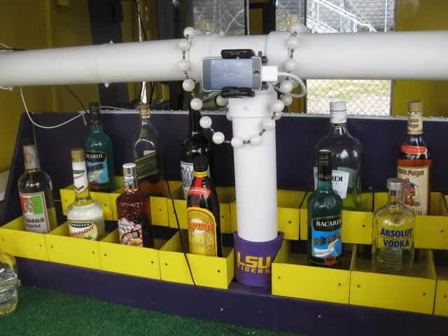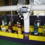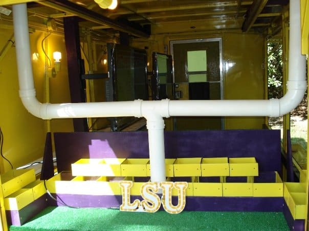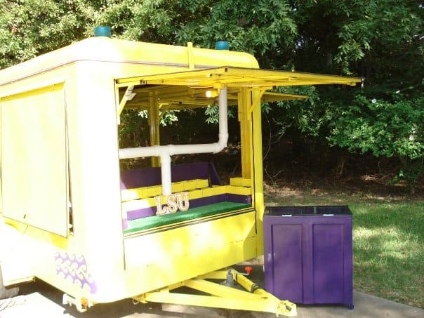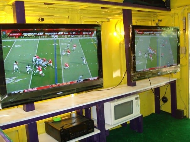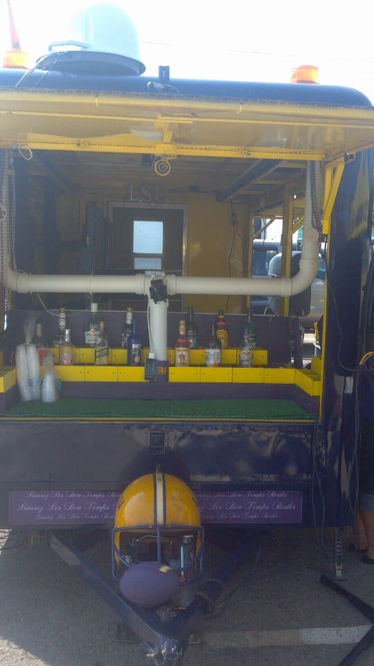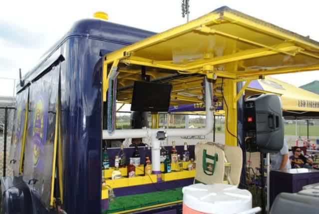 This used to be a sunglasses trailer that we bought from someone. He was an LSU fan and it was already painted yellow with purple flames. My friend and I bought the trailer and did all the custom work, mounting, etc. Only thing that we paid to have done was have the trailer painted purple. With the cost of the trailer and all equipment and materials, we have probably spent close to $8500-$9000. Like you see in the pictures, we have a bar with a TV at the bar. We either play a game there so you don’t miss a play while fixing a drink, or we play music videos during tailgating. We have two 40 inch LCDs, with a winegard satellite. We call ourselves Krewe of Monroeaux, Kings of Tailgating. We are from Monroe, LA so that is why we picked that name.