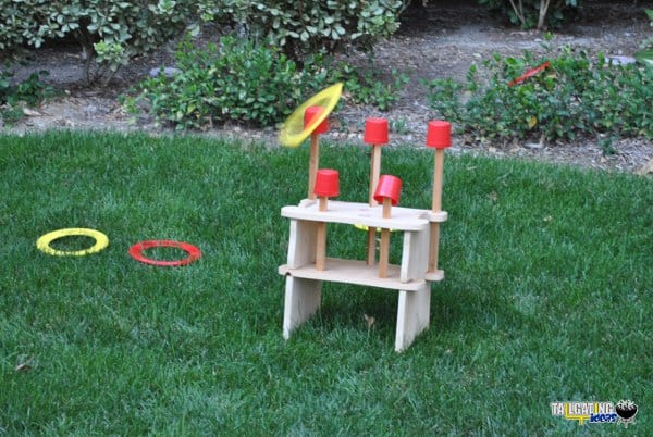 As you can see in the photo, Ringer Toss is a game that uses wooden planks, sticks, plastic cups and flying discs for each team to throw. Combining the elements of good old fashioned ring toss from the carnival midway to Polish Horseshoes where you are knocking an object off to score points, Ringer Toss is a unique game we had never seen before.