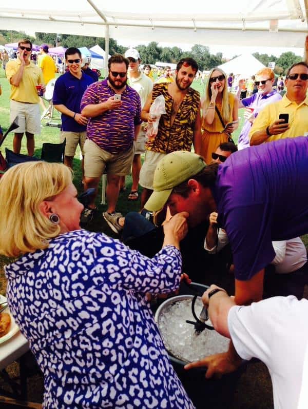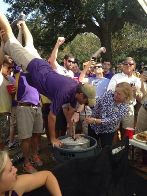 Mid-term elections are about six weeks away and it is a full court press for Congressional members and Senators to go out and campaign as if they are “one of the people”. Apparently that included Senator Mary Landrieu (D-LA) hitting Baton Rouge on Saturday visiting tailgate parties prior to LSU hosting Mississippi State. Although not dressed like an LSU fan (her shirt looks more like a blue cheetah pattern) she demonstrates that when in Rome, do as Romans do… which includes assisting in pulling off a successful keg stand.