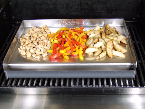 - Sizzle-Q 180 – 18″ wide x 13″ deep x 3″ high (Made of 14 gauge 430 Stainless Steel. Highly portable and makes the perfect tailgating accessory) – $69.99 + $15 flat rate shipping