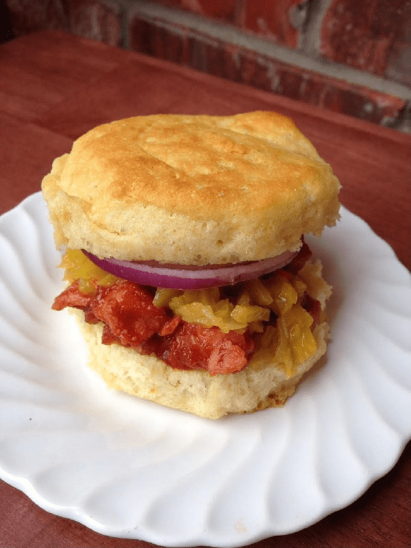 Hoosier BBQ Ham on Cornbread Biscuits With Country Relish