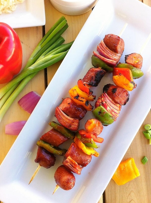 - Thread the sausage and a variety of veggies onto each skewer.