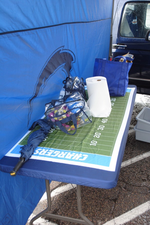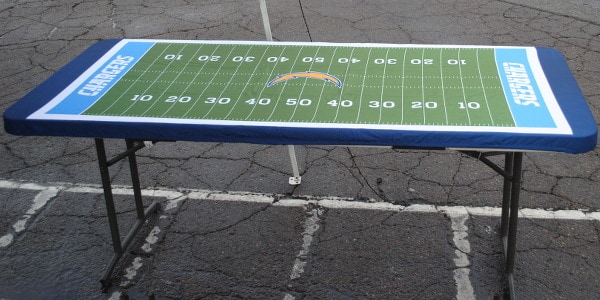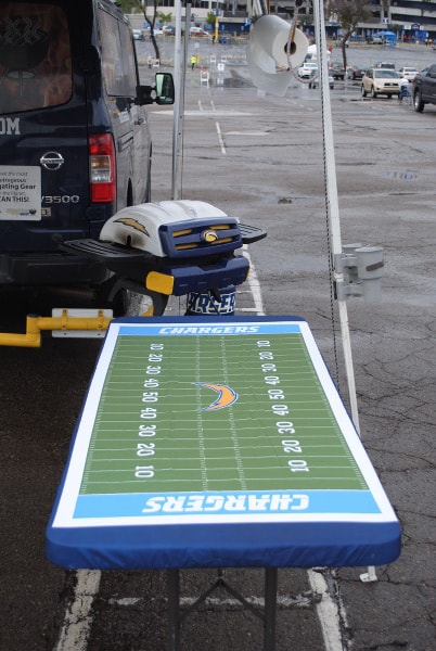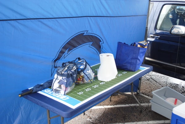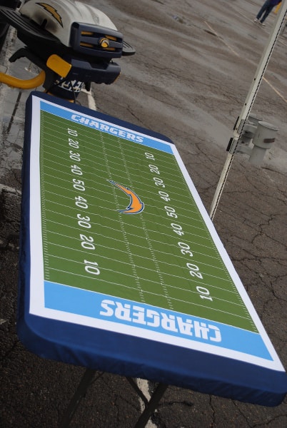We had a chance to test out the TableTopIt the other weekend prior to the San Diego Chargers vs. the Cleveland Browns game. It was a little rainy and windy that day but as you can see from the photos, the table resisted the water and stayed tight around the corners of the table even in the wind.
