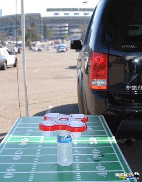 We took Tower Pong to a recent San Diego Chargers tailgate party to test it out. Because Qualcomm Stadium has a strict “No Glass Policy”, we chose to place the Tower Pong game over a plastic water bottle rather than a beer bottle. (Had glass been allowed in the parking lot, we would have totally used a beer bottle.)