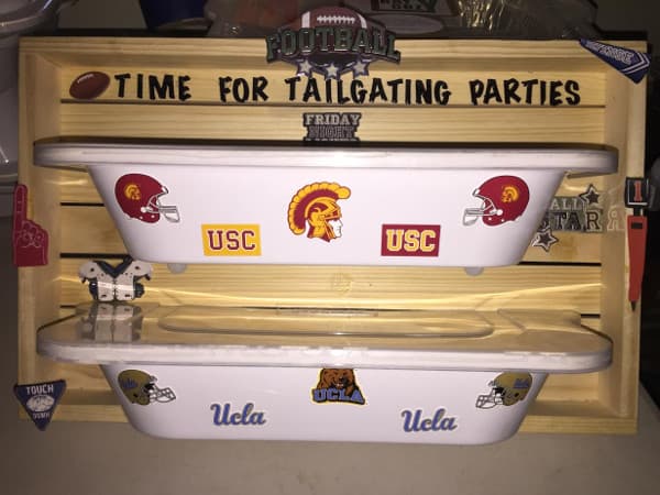 We recently discovered the Tray Cozy. Simply explained, the Tray Cozy is a dish-washer safe melamine dish and snug fitting plastic lid. It is designed to avoid spills during transportation of your tailgating food in aluminum pans. In addition to keeping the food from spilling, the lid helps keep foods hot or cold. In addition to those features, the Tray Cozy allows you to place a hot pan in it and then pick it up without having to use pot holders or oven mitts.