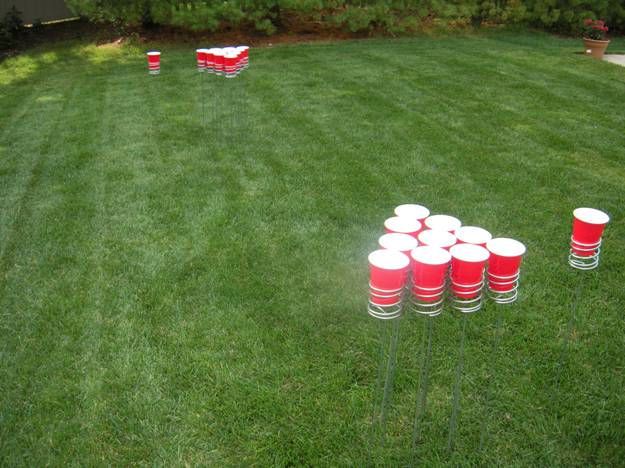 I am constantly learning of new products and innovations in the world of tailgating and beer pong. Just when I thought I had seen every type of way you can play beer pong, along comes Yard Beer Pong. From the looks of it, it consists of metal stakes with spiral cup holders at the top. The stakes jab into soft ground (sorry asphalt tailgaters) and the game is played without a table. With no table joining the two racks together it takes the bounce rule completely out of play. Take a look at it set up.